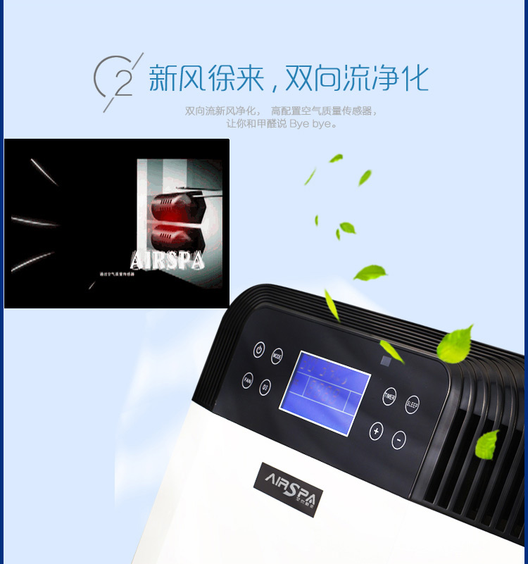 2、超大液晶顯示,自動顯示功能模式,風量大小,室內溫度,濕度,空氣質量